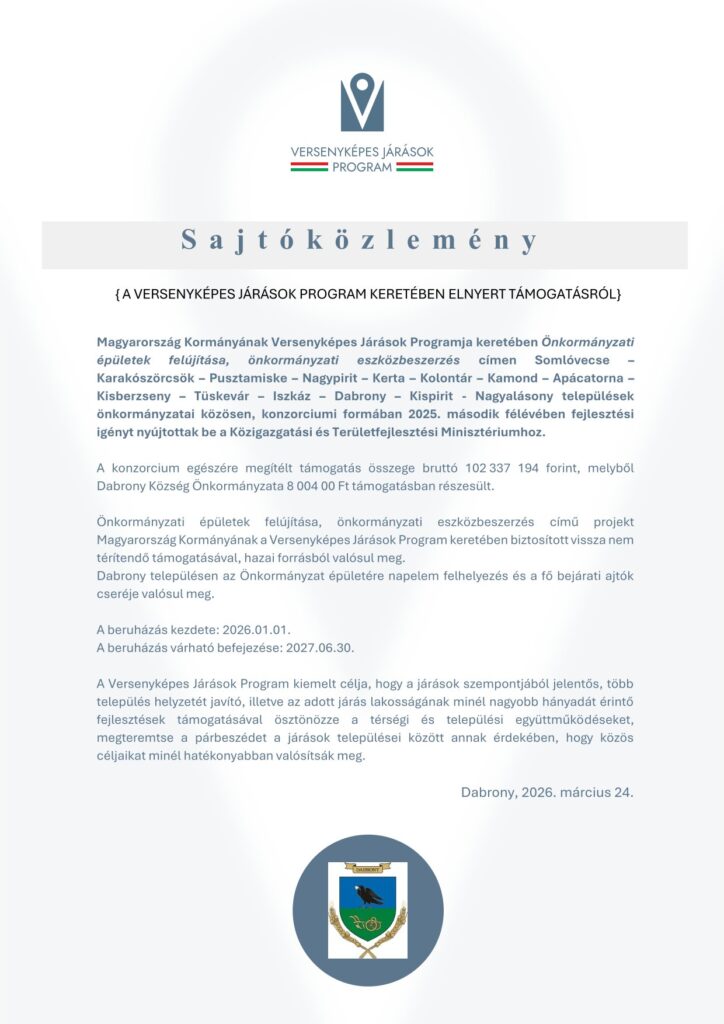 Versenyképes Járások program 2026 Önkormányzati épületek felújítása, önkormányzati eszközbeszerzés