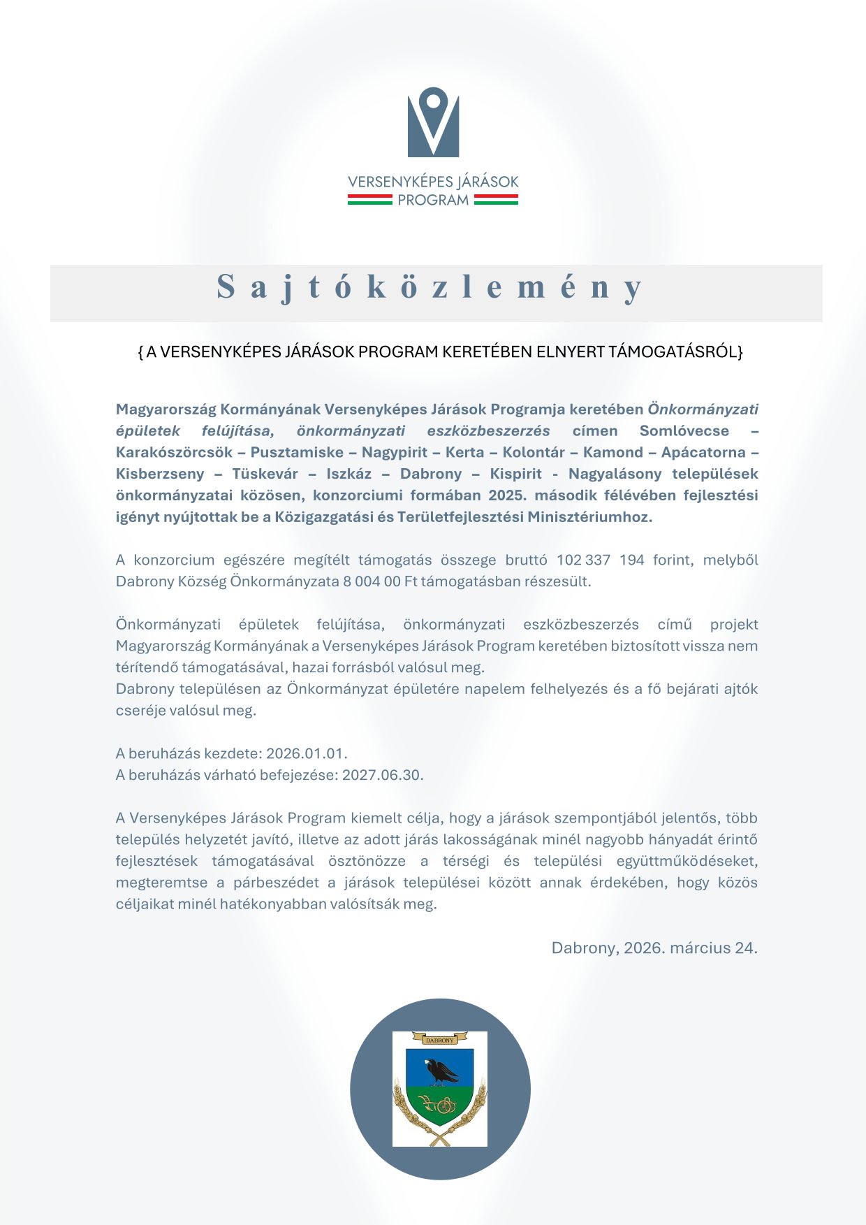 Dabrony Közszég Önkormányzata eladásra kínálja a tulajdonában lévő Suzuki Vitara 1.6 diesel személygépjárművet. Tulajdonságok: 2015 évjárat, 2027.11.12-ig műszakival, 65.500 km-rel, ...